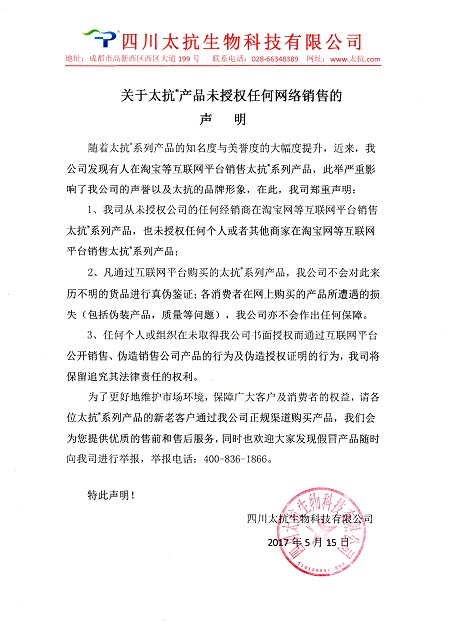 關(guān)于太抗?產(chǎn)品未授權(quán)任何網(wǎng)絡(luò)銷售的聲明
